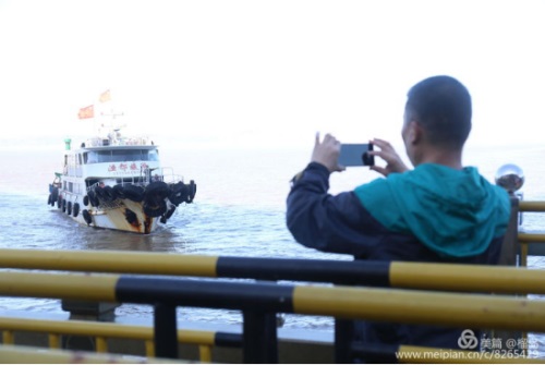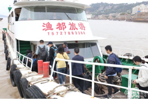 時(shí)光冉冉,早餐后,我們懷著依依不舍的心情,背起行囊要乘船返航玉環(huán)坎門了。接送我們返航的漁船:“漁都”號(hào),向我們駛來。